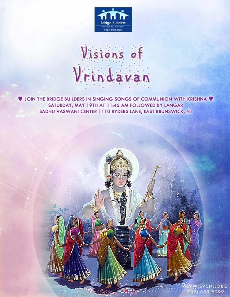 Visions of Vrindavan Bridge Builders singing Krishna Dhunis from 11.45 AM to 1.15 PM followed by langar Saturday, May 19, 2018 11:45 AM 1:15 PM 11:45 13:15 Google Calendar ICS